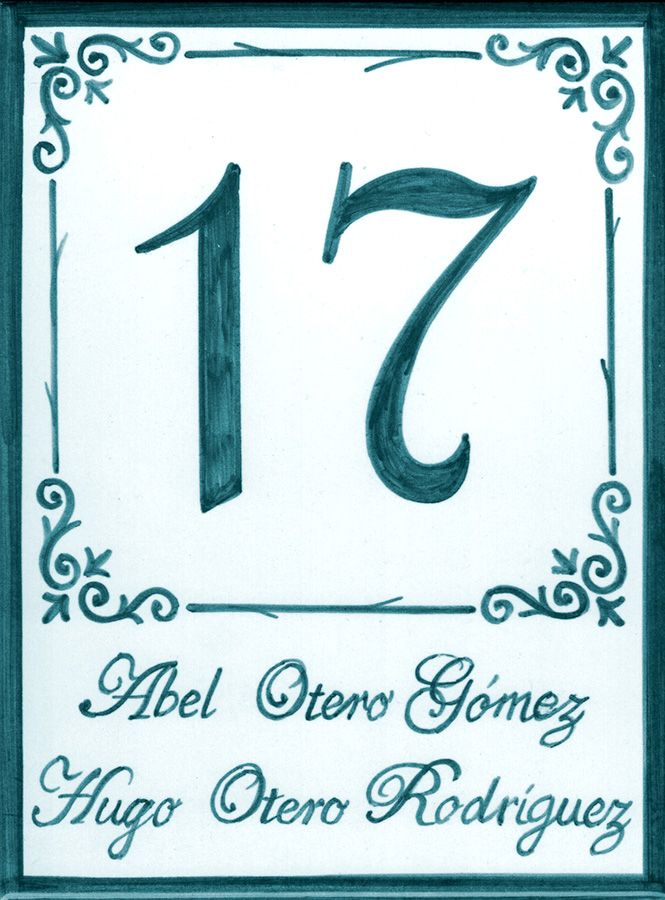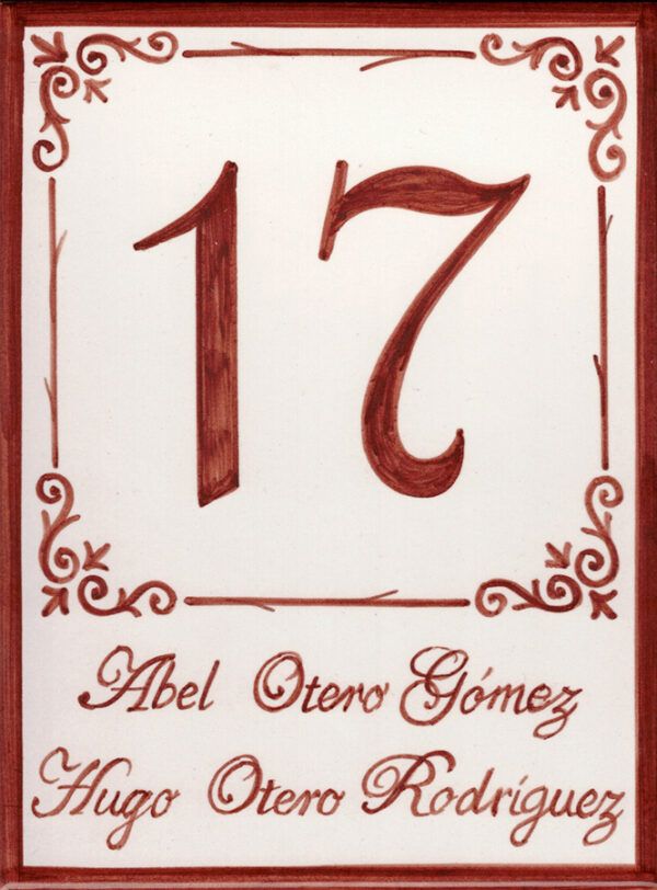 Azulejo pintado a mano y artesanal con número y letrero en cerámica personalizado con los nombres de los inquilinos de la vivienda.