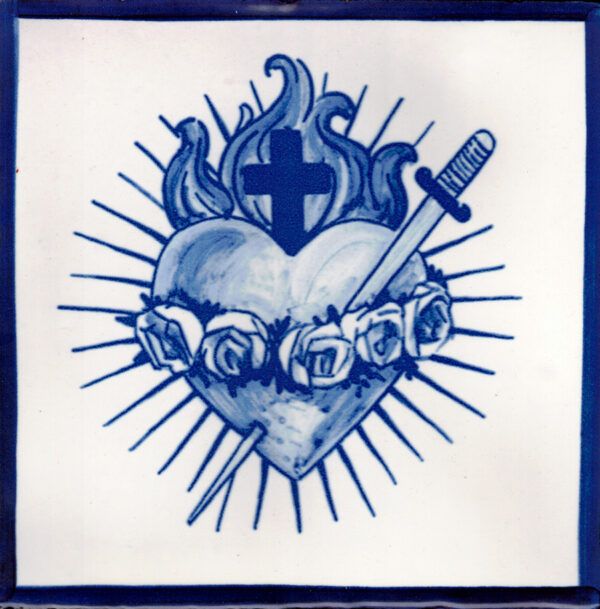 Azulejo religioso con reproduccion calcográfica del Corazón de María . Realizado de forma artesanal y acabado antiguo.