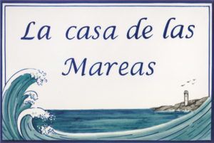 Composición de azulejos de 15 x 15 cm pintados a mano y artesanales, alargada con letras grandes y rematado el conjunto con un motivo de fruto en este caso unas nueces en una esquina que le da un toque personal.